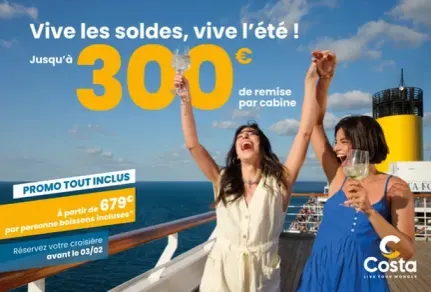 Les Soldes de Costa Croisières : jusqu’à 300 € de réduction par cabine Chaque année, les Soldes de Costa Croisières sont un rendez-vous très attendu par les voyageurs en quête de croisières au meilleur prix, sans compromis sur la qu[...]